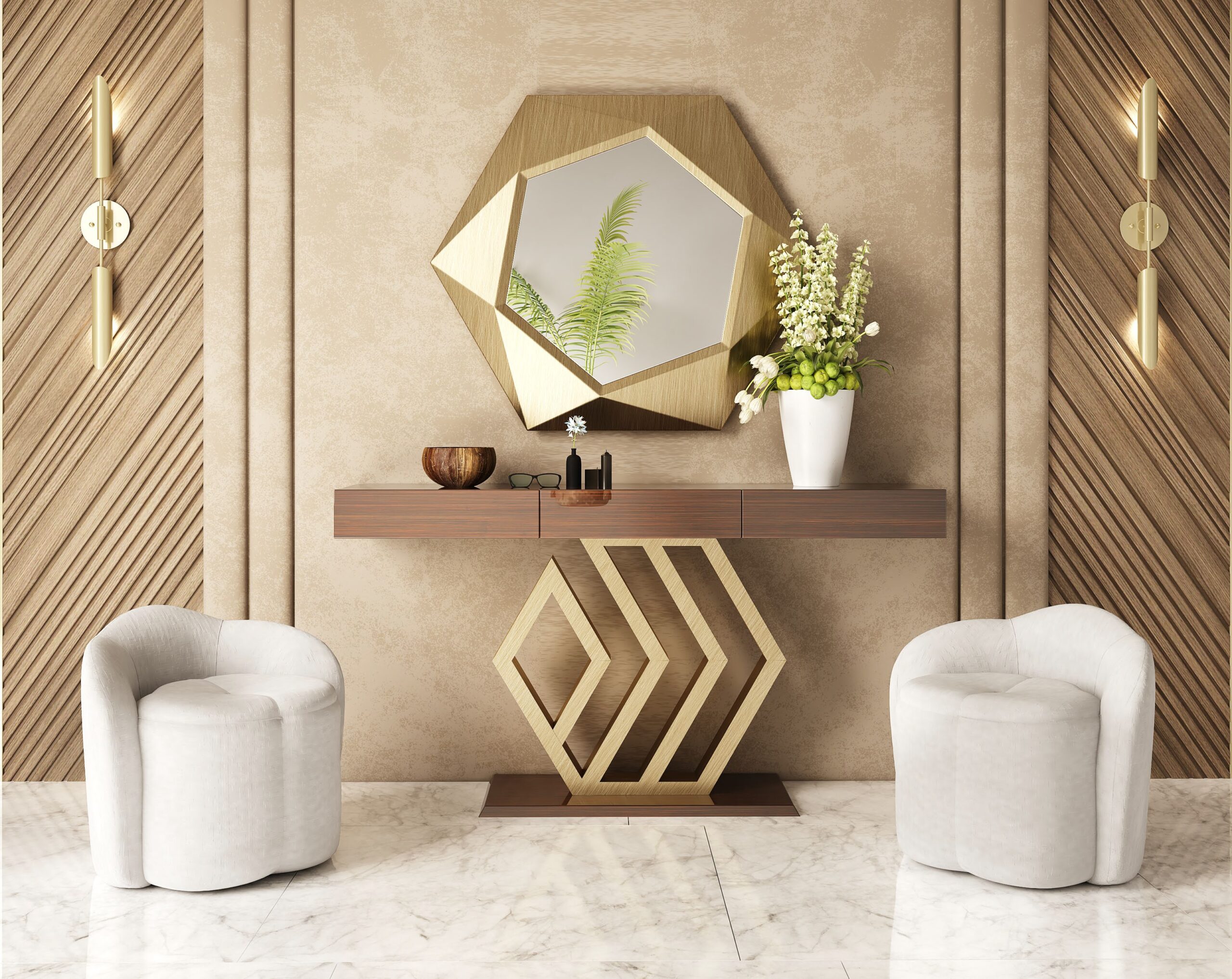 El conjunto se complementa con un espejo poligonal en acabado dorado, que rompe con lo convencional y convierte el recibidor en una pieza decorativa de impacto. Ideal para hogares modernos que buscan diseño exclusivo y funcionalidad en un solo mueble.