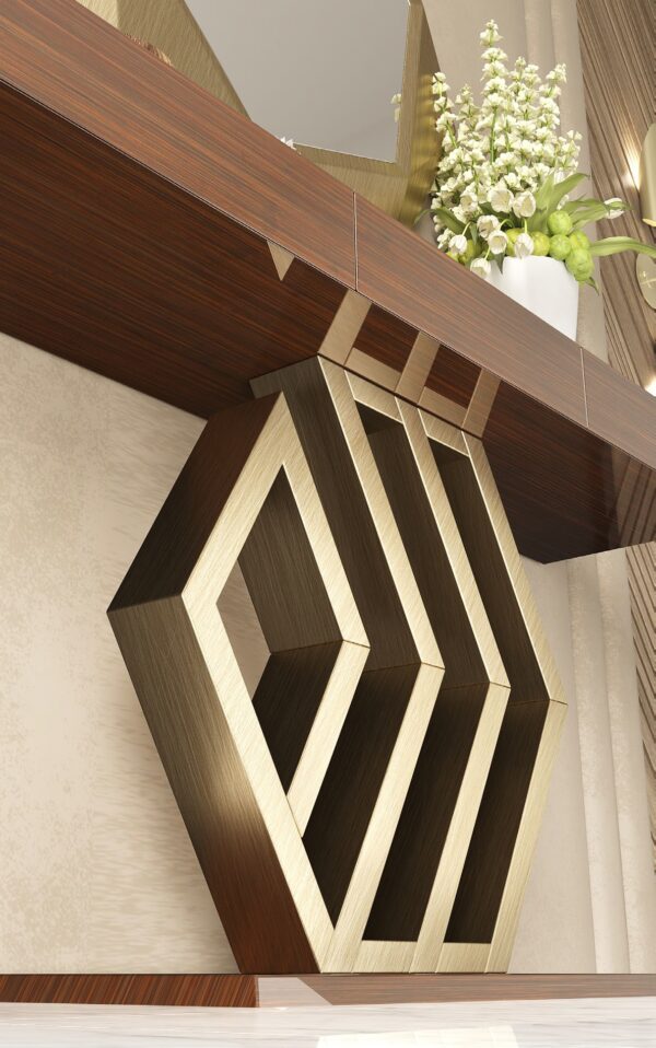 Este recibidor en madera y dorado aporta calidez y distinción a cualquier entrada. Su superficie de madera en tonos naturales transmite elegancia atemporal, mientras que su base geométrica dorada aporta dinamismo y un toque de sofisticación contemporánea.