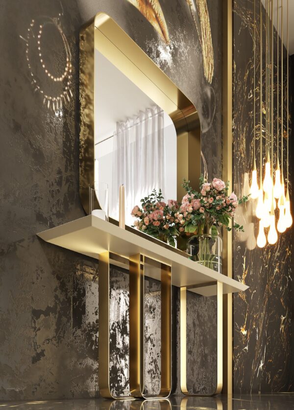 El diseño se realza con un espejo rectangular con esquinas redondeadas y marco dorado, perfecto para reflejar la luz y ampliar el espacio en la entrada de tu hogar. Una propuesta elegante que convierte cualquier recibidor en un lugar con carácter propio.