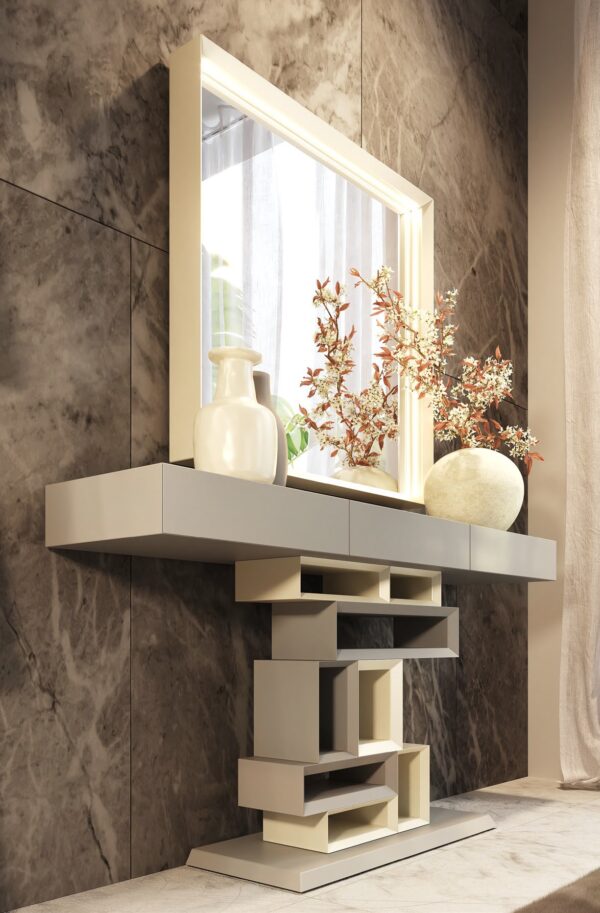 Este recibidor moderno destaca por su original base de figuras geométricas entrelazadas, que aporta dinamismo y carácter a la pieza. Su estructura en tonos neutros ofrece un diseño elegante y versátil, capaz de integrarse en diferentes estilos de decoración.