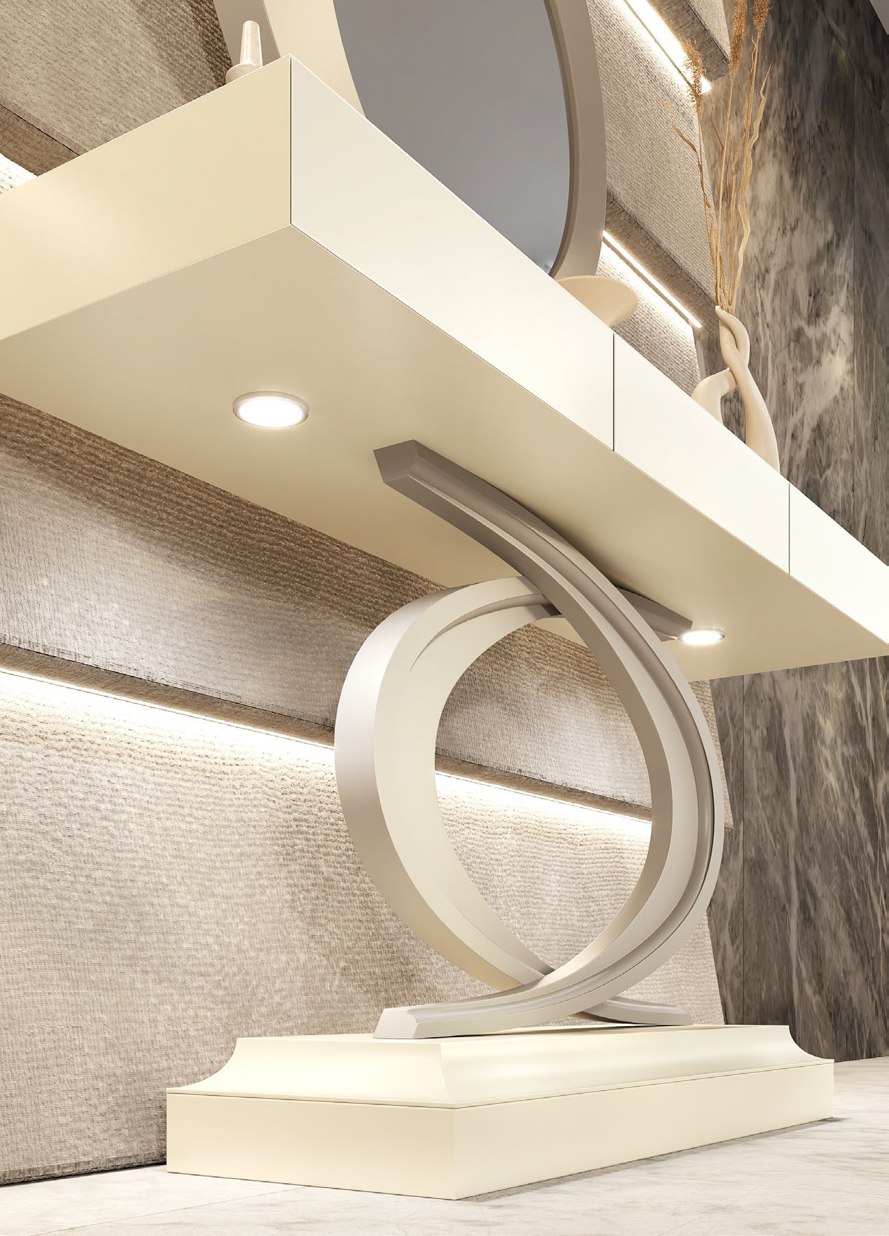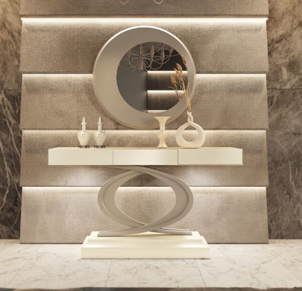 Un recibidor que destaca por su diseño escultórico y contemporáneo. La estructura en blanco y beige crea una estética equilibrada y luminosa, mientras que su base en forma de curvas entrelazadas aporta dinamismo y originalidad.
