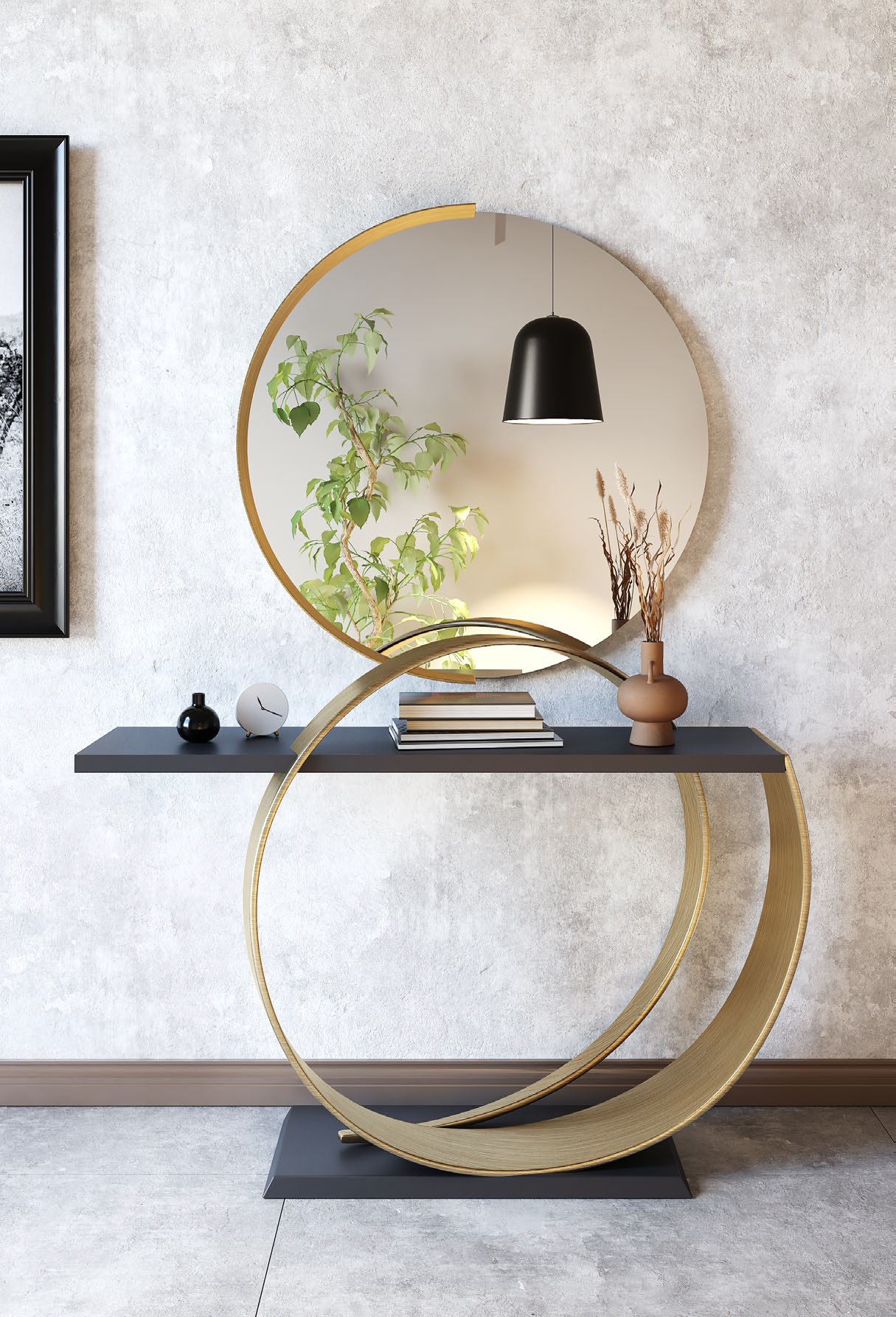 Este recibidor negro y dorado es una obra de diseño moderno que combina sobriedad y lujo. Su base circular metálica en acabado dorado aporta dinamismo y movimiento, mientras que la encimera en negro mate añade un contraste elegante y sofisticado.