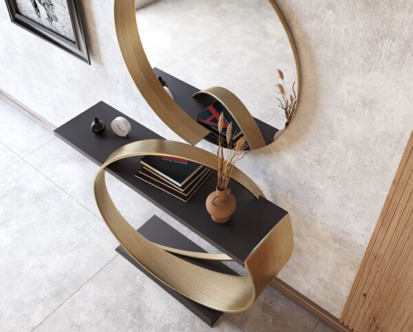 El conjunto se complementa con un espejo redondo enmarcado en dorado, que amplía la luminosidad y crea un efecto decorativo de gran impacto. Ideal para entradas modernas donde el diseño se convierte en protagonista.
