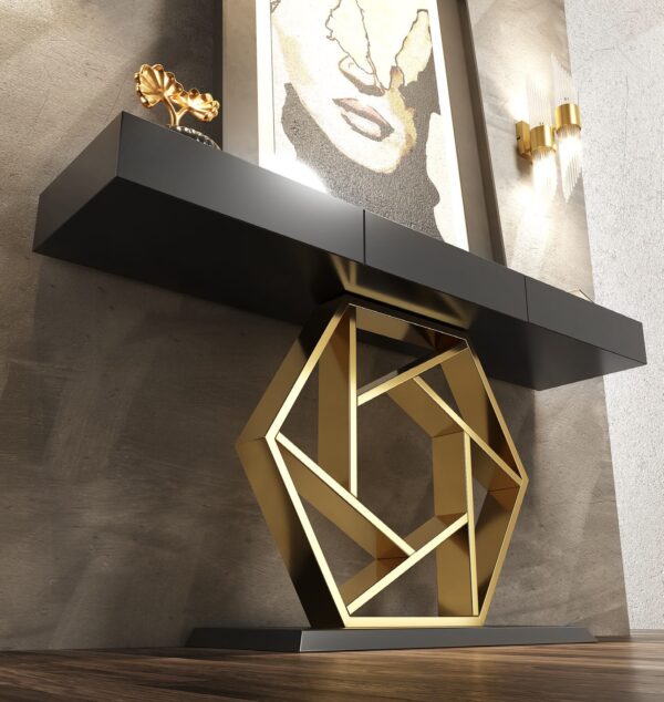 Este recibidor negro y dorado destaca por su diseño escultórico y contemporáneo. La superficie en acabado negro aporta sobriedad y elegancia, mientras que la base dorada en forma geométrica hexagonal introduce dinamismo y sofisticación al conjunto.