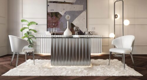 • Mesa de comedor con base ondulada plateada y sobre de cristal