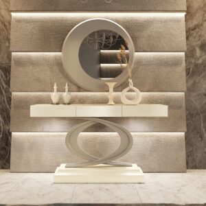 Recibidor moderno en blanco y beige con base escultórica y espejo circular