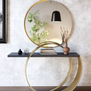 Recibidor negro y dorado con base circular y espejo redondo – Diseño moderno y exclusivo